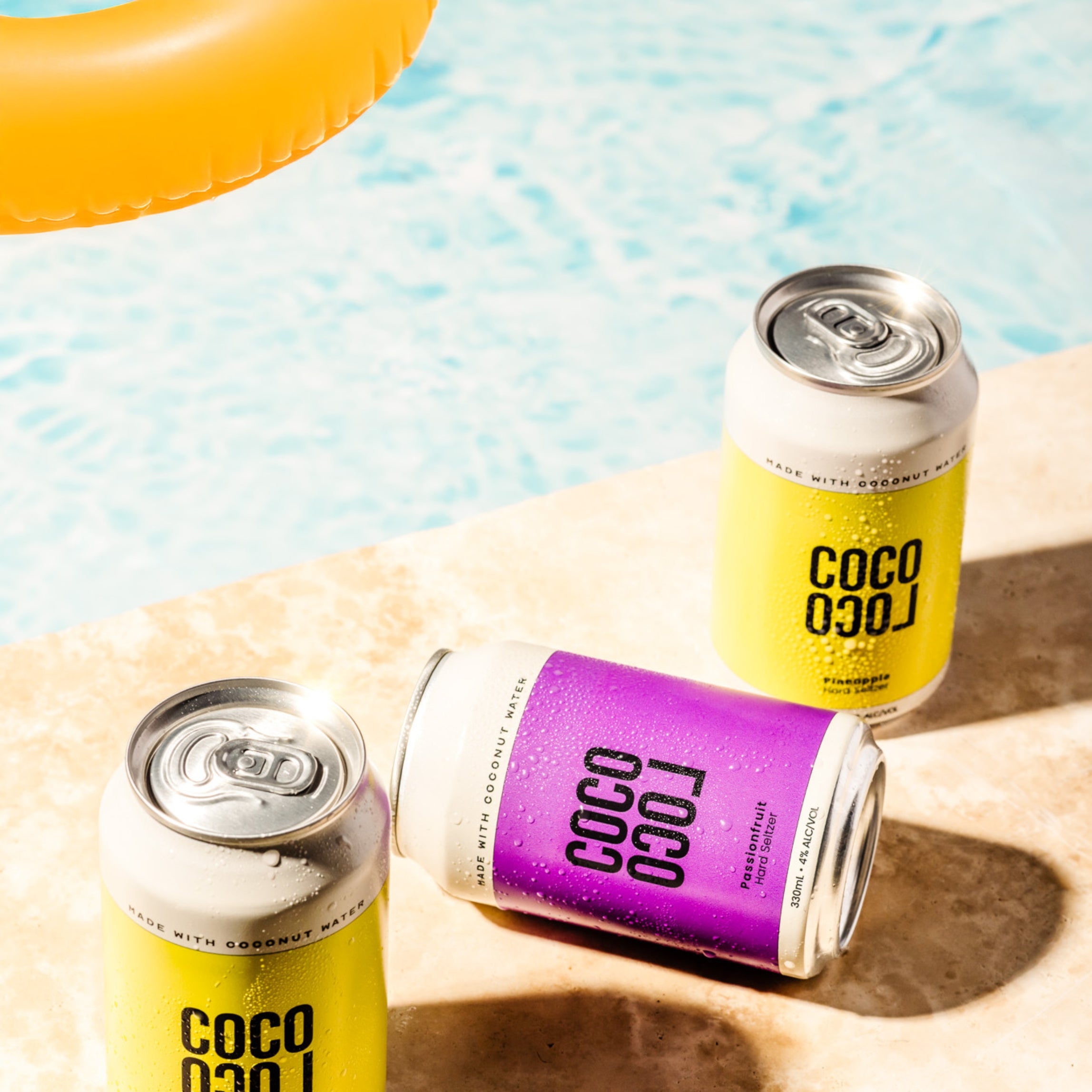 The Summer Spritz Bundle includes: 4-pack Coco Loco Pineapple, 4-pack Coco Loco Passionfruit, two can-shaped glasses, two stubby holders, and a specialty ice tray.